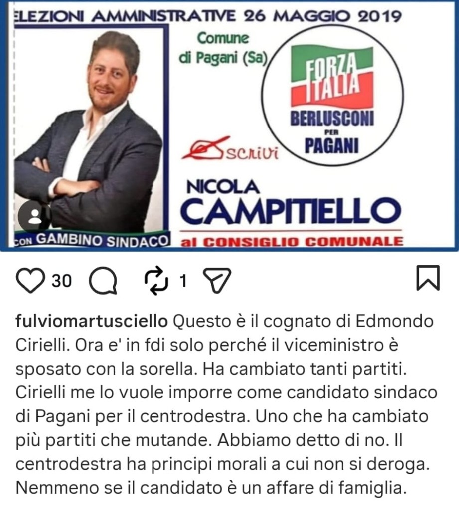 Motivo del contendere, che per ora registra il silenzio di Cirielli, le prossime Comunali di Pagani. Nel comune dell’Agro Nocerino-Sarnese di 35mila abitanti, Cirielli prova a tirare la volata per la poltrona di sindaco puntando su suo cognato, Nicola Campitiello, un medico del posto (7 anni fa nelle file degli azzurri). Subito e aspramente bocciato bollato da Martusciello come “uno che ha cambiato più partiti che mutande”. “Cirielli me lo vuole imporre”, precisa l’azzurro. E attacca “l’affare di famiglia” sul quale Forza Italia non concorda.