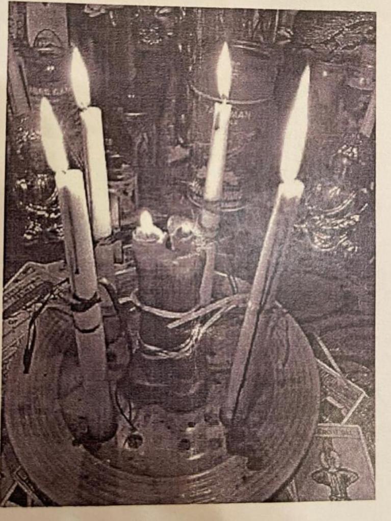 Tre foto di lavori di magia nera e legamenti, altare con oggetti personali, cravatta e bambole di cera voodoo