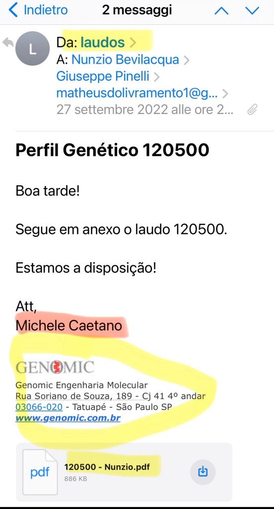 Come avevo già parlato con Lethicia (conferma che conversava con la stessa addirittura anche, secondo testimonianze, telefonicamente durante il prelievo del sangue di Bevilacqua a Sao Paulo quando la scoperta da parte di Nunzio dell’assenza di laboratorio nella struttura aveva destato non pochi imbarazzi tra gli operatori sanitari li presenti ndr) il mio cliente, Nunzio Bevilacqua, che è in copia, ha fatto prelevare un campione di sangue il 12/07/2022, presso Genomic a San Paolo, per verificare la paternità, e ora ha bisogno di un profilo genetico (in attesa che la controparte dopo un “lungo tempo”, dopo che era stata ‘informata’ sul laboratorio responsabile, decidesse di sottoporre a test la bambina e si procedesse alla comparazione, viene chiesto intanto un profilo individuale di Nunzio per averlo a propria disposizione ndr). Ci è stato dato l’importo di R$ 550,00 per effettuare questo servizio e vorremmo sapere quali metodi di pagamento sono disponibili per contrattare.