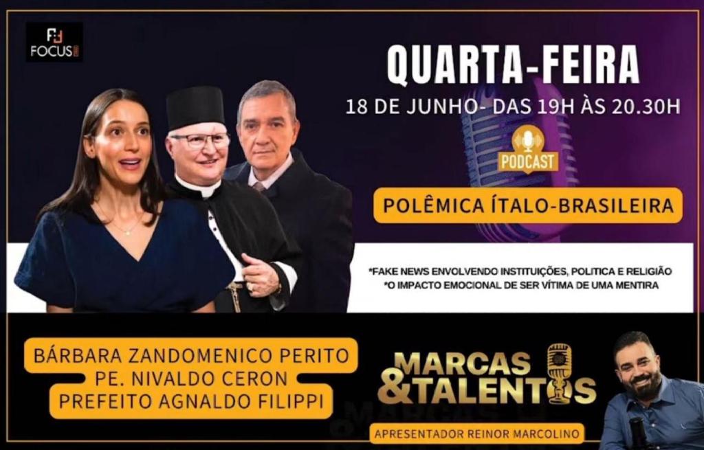 Una locandina aveva annunciato la trasmissione del 18 giugno scorso, dalle 19.00 alle 20.30, titolando su una “polemica italo-brasiliana” e su “bufale che coinvolgono le istituzioni, la politica e la religione – L’impatto emotivo dell’essere vittime di una bugia”. Un format creato ad hoc, emesso da una piccola emittente web, Dm News Sc, con la partecipazione di Filippi, del prete della Chiesa Cattolica Romana Padre Nivaldo Ceron (che i lettori de L’identità ricorderanno proprietario del Castello di Treze de Maio), originario di Urussanga da poco legata da un patto d’amicizia con l’italiana Valdobbiadene, e Barbara Zandomenico Perito, l’insegnante di portoghese per stranieri conosciuta in Brasile dall’avvocato italiano Nunzio Bevilacqua.