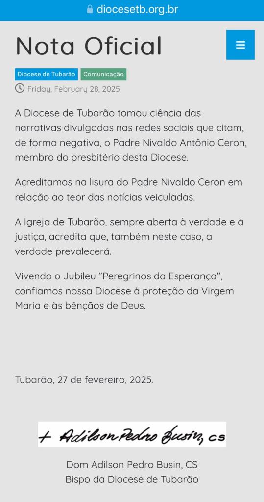 La Diocesi di Tubarão era a conoscenza delle narrazioni pubblicate sui social network che citano negativamente Padre Nivaldo Antônio Ceron, membro del presbiterio di questa Diocesi.