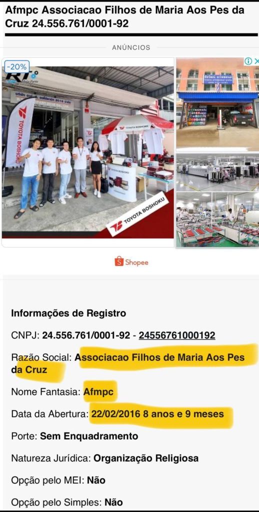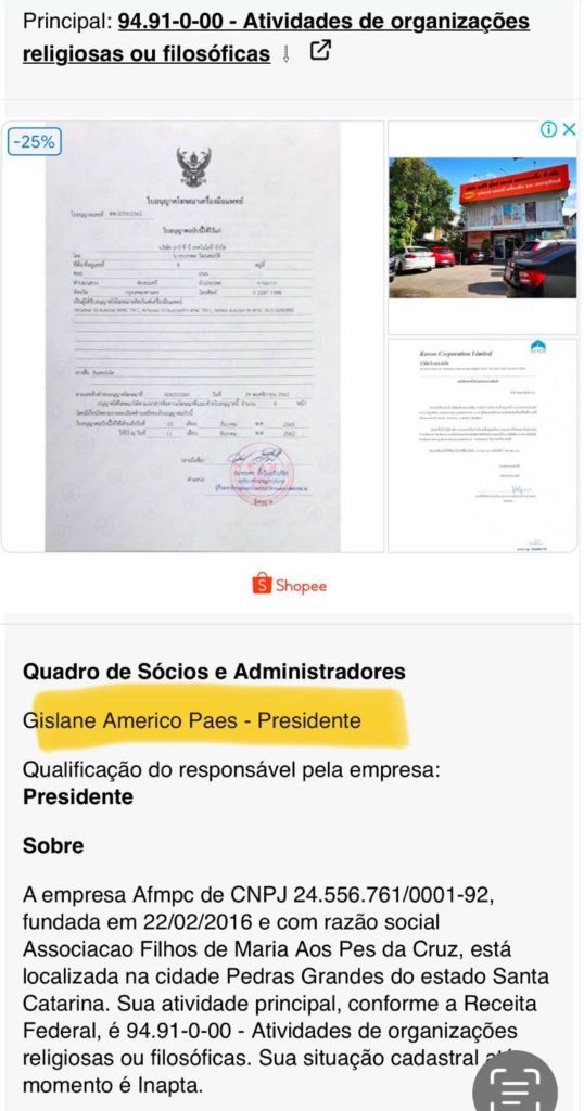 Questa “sedicente” associazione religiosa – sarebbe di interesse conoscere se il Vaticano la reputi aderente all’insegnamento della Chiesa Cattolica di Roma dalla quale forse aspirava ad ottenere una “elevazione” o un “accostamento” per il tramite di Padre Nivaldo Ceron – si chiama Afmpc, “Associacao Filhos de Maria Aos Pes da Cruz“, ha per presidente Gislane Americo Paes (di Criciuma e della ormai nota famiglia delle Paes) e sede proprio nel piccolo borgo di circa 4200 anime di Pedras Grandes. Per tutti i contatti (email e telefono) riguardanti le interazioni con questa attività “protetta” dal territorio pur non avendo, a nostro avviso, assai trasparenti fini, indica i riferimenti di un certo Luciano De Faveri.