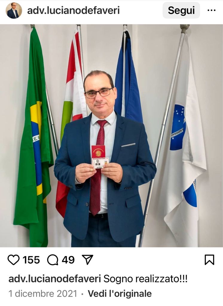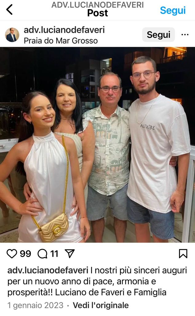 De Faveri è la persona che – secondo l’indagine investigativa svolta per conto dell’avvocato Bevilacqua – conoscerebbe – grazie allo storico e profondo rapporto con la realtà comunale – gli “arcani” di Pedras Grandes, dalla “Missionaria” (di cui sarebbe stato il referente amministrativo, ndr) e dunque il fine reale di tutte quelle “gravidanze angeliche”, alla “Matriarca”, nonché la famiglia Zandomenico (ramo materno in Pedras Grandes dell’italo-brasiliana Barbara Zandomenico Perito). I numeri dell’Associazione infatti corrispondono a lui, un commercialista di Pedras Grandes divenuto avvocato nel 2021 a Santa Catarina e affiliato al partito progressista in cui milita il sindaco del paese, il prefeito Agnaldo Filippi che vanta pubblica passione per l’Italia.