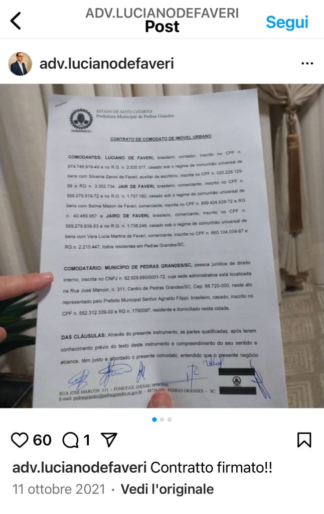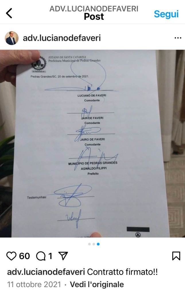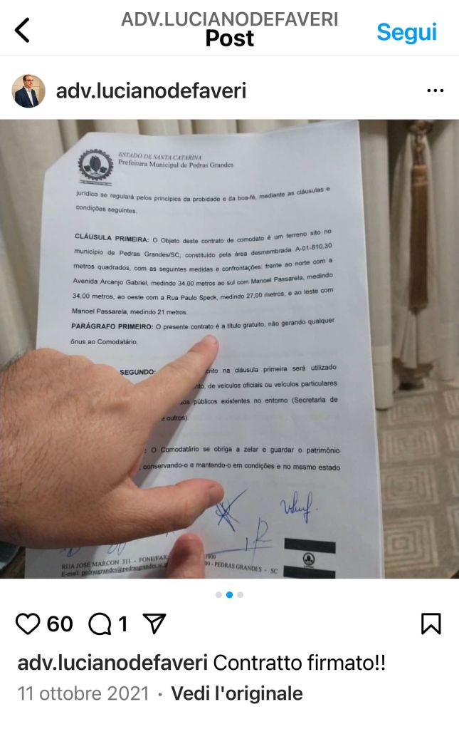 Prima di questi fatti, De Faveri in data 20 settembre 2021 cedeva in “comodato gratuito” al Comune di Pedras Grandes – già allora guidato dal prefeito Agnaldo Filippi – un immobile urbano che appare essere di notevole importanza.