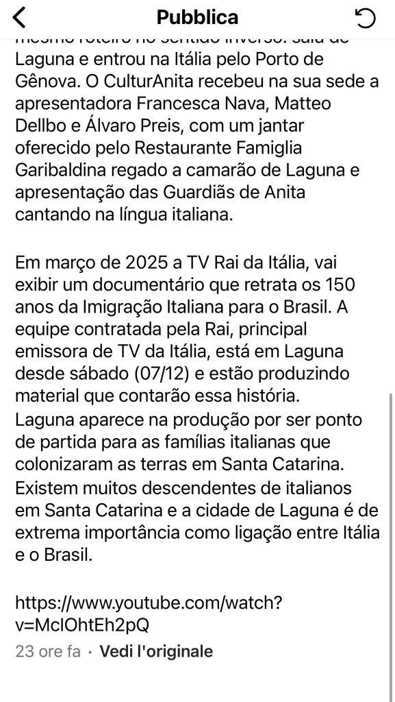 In questo territorio, a Laguna, sta operando in questi giorni , secondo i social, la troupe della Rai guidata da Francesca Nava, giornalista di “Presa diretta”, per realizzare un documentario da mandare in onda nel marzo dell’anno prossimo sulle origini dell’immigrazione italiana e su Anita Garibaldi. Argomenti di grande interesse culturale ritenuti oggi più urgenti, in una trasmissione del servizio pubblico a spese contingentate, di quelle “verità negate” denunciate da un nostro connazionale.