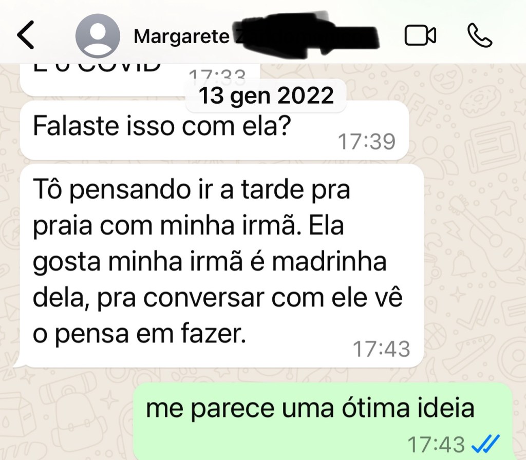 Sto pensando di andare al mare (a Laguna a casa di Barbara ndr) questo pomeriggio con mia sorella (la zia ostetrica Janete che abbiamo sentito conversare nell’audio esclusivo della Dire con la madre Margarete circa riti di magia nera effettuati su Nunzio e numerose altre persone probabilmente anche italiani ndr). Le piace (sembrerebbe un po’ una ‘guida’ per le iniziative di Barbara ndr), mia sorella è (d’altronde ndr) la sua madrina, così può parlarle e vedere cosa ha in mente di fare.