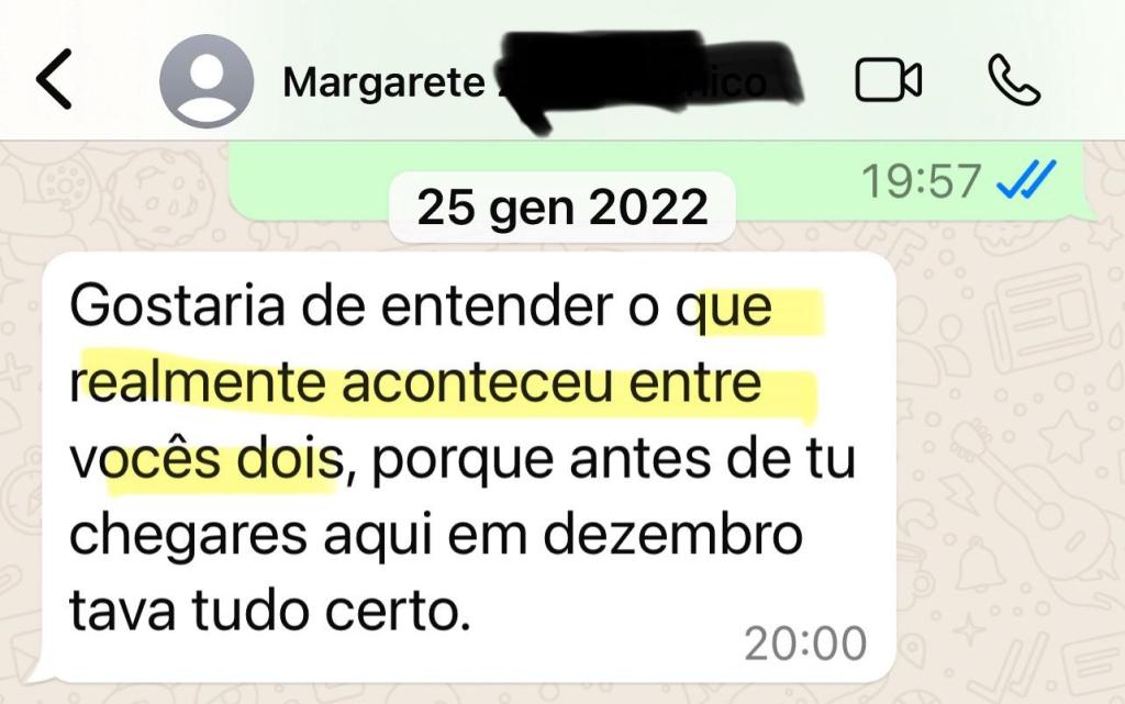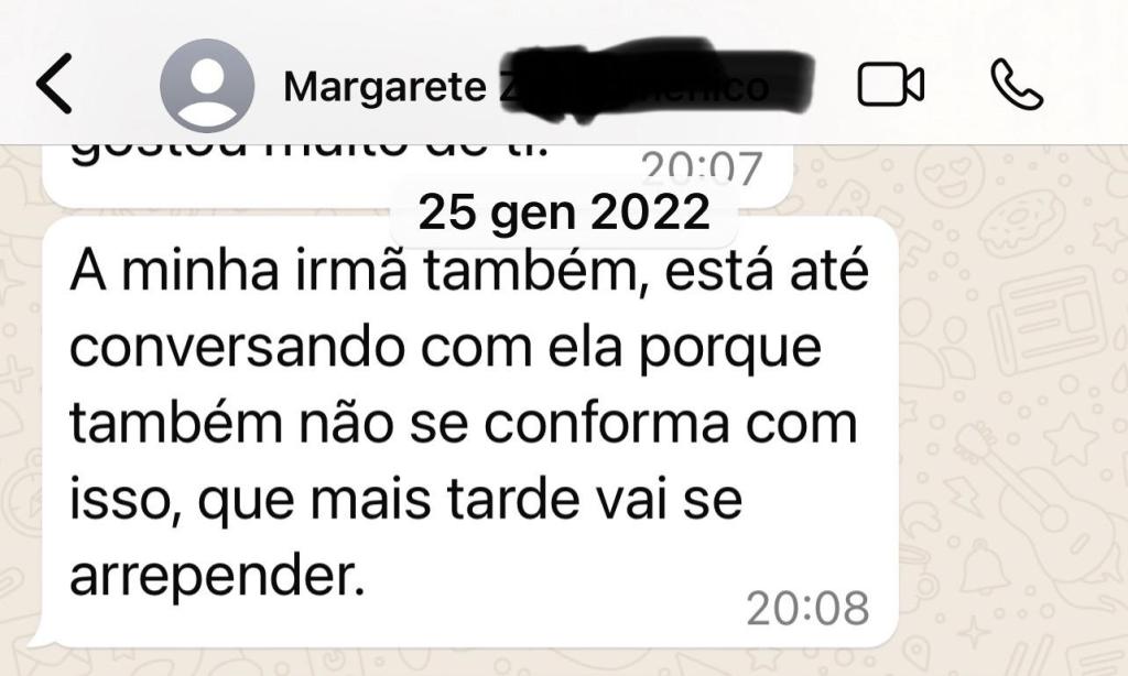 I messaggi Whatsapp a seguire, tutti di gennaio 2022, mostreranno una Margarete, la madre di Barbara, che si finge “amica” di Nunzio (da tenere a mente Barbara che nella chiamata del’11 maggio 2022 diceva “non c’è amicizia con i miei genitori”, ndr) esprimendo le medesime sue perplessità su ciò che inspiegabilmente starebbe avvenendo.
