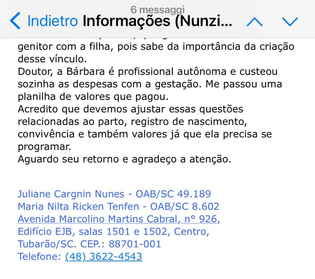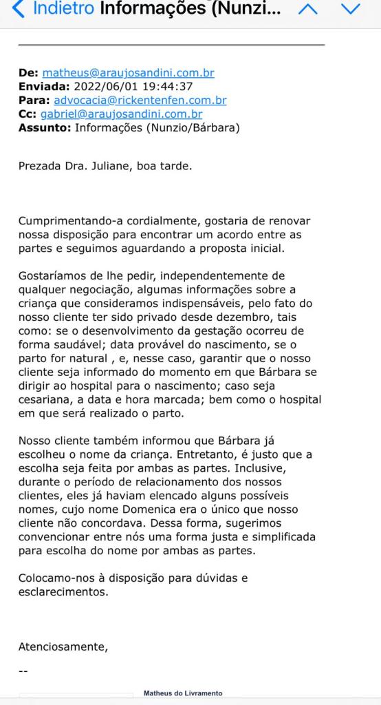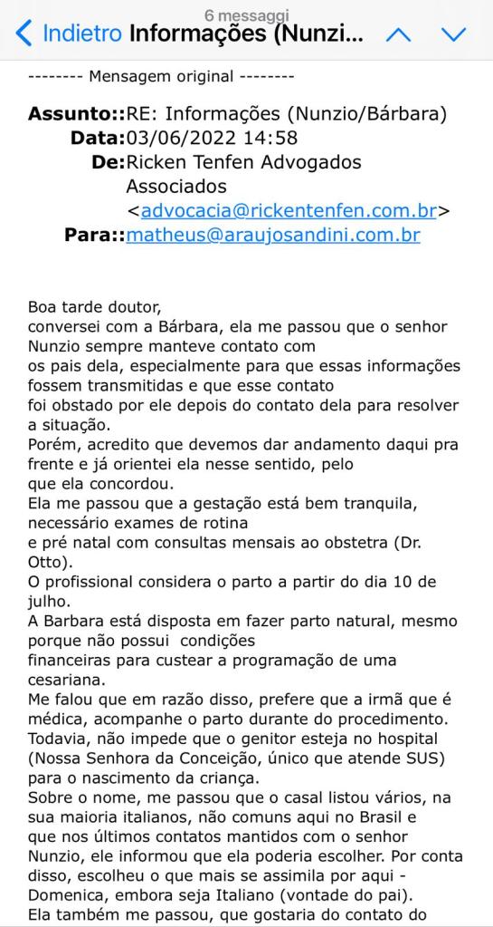 Vorremmo chiederti, a prescindere da qualsiasi trattativa, alcune informazioni sulla bambina che riteniamo essenziali, in quanto il nostro cliente ne e’ stato privato da dicembre (2021 quando fu allontanato dopo la famosa ecografia, da parte del Dr. Murilo dos Santos May , dove a 10 settimane e 4 giorni si riusciva, secondo lo specialista, già a vedere che era femmina, ndr), quali: se lo sviluppo della gravidanza è sano; la data probabile di nascita, se il parto è naturale, e, in questo caso, garantire che il nostro cliente venga informato quando Barbara si reca in ospedale per il parto; se si tratta di un taglio cesareo, la data e l’ora previste; così come l’ospedale dove avverrà il parto.