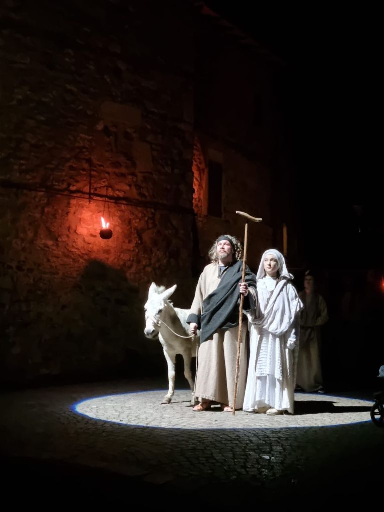 Oltre 250 figuranti, 800 metri di percorso, fiaccole, botteghe, mestieri e la Natività nella Rocca trasformano il borgo in una Betlemme medievale a cielo aperto.