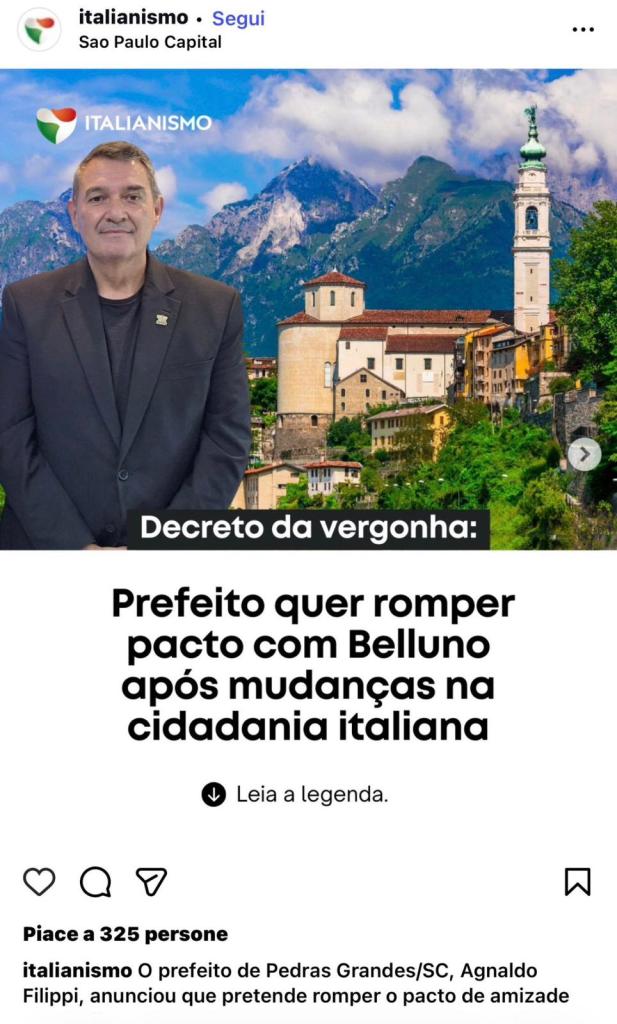 Dopo gli improperi contro il nostro ministro degli Esteri Antonio Tajani (che sembrerebbe essersi abituato a subirli da alcuni “oriundi” brasiliani senza reagire). Dopo i toni minacciosi contro la splendida città di Belluno (“gliela farò pagare”, diceva in un video che abbiamo pubblicato) e gli ulteriori insulti gravi, a valle delle querele già ricevute da Nunzio Bevilacqua, nei confronti dell’avvocato italiano durante l’ultima intervista delle Iene Inside su Italia Uno del 21 novembre (gli si consente in mondo inspiegabile in una puntata andata in onda in differita di farlo apostrofare gratuitamente come “psicopatico”), adesso è proprio lui, Agnaldo Filippi a volere, non si sa per quale ragione (ma interessante sarebbe leggere l’accordo) lo scioglimento del “patto d’acciaio” di amicizia con il capoluogo veneto.
