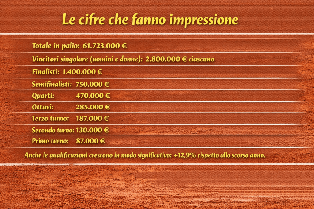 Il montepremi complessivo del Roland Garros ha superato la soglia dei 61.723.000 milioni di euro, con una crescita costante rispetto alle edizioni precedenti. I campioni del singolare maschile e femminile incassano un assegno da 2.550.000 euro, mentre i finalisti si fermano a 1.275.000 euro. Anche semifinali e quarti di finale restano su livelli altissimi, con cifre che consolidano il torneo francese tra le vette economiche del circuito. Ma il dato forse più significativo è quello legato ai primi turni, chi perde al primo turno del tabellone principale porta comunque a casa 78.000 euro.