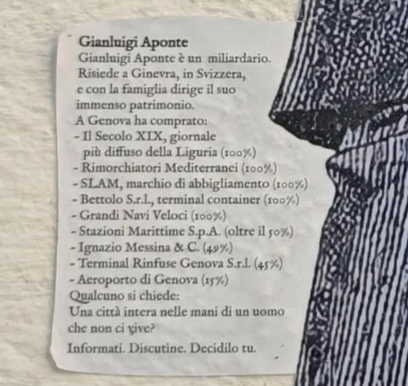 La pagina Facebook Street art in Genoa – racconta Shipping Italy – ha documentato la comparsa di un manifesto anonimo che mette nel mirino Gianluigi Aponte, armatore patron Msc, figura centrale dell’economia marittima globale.